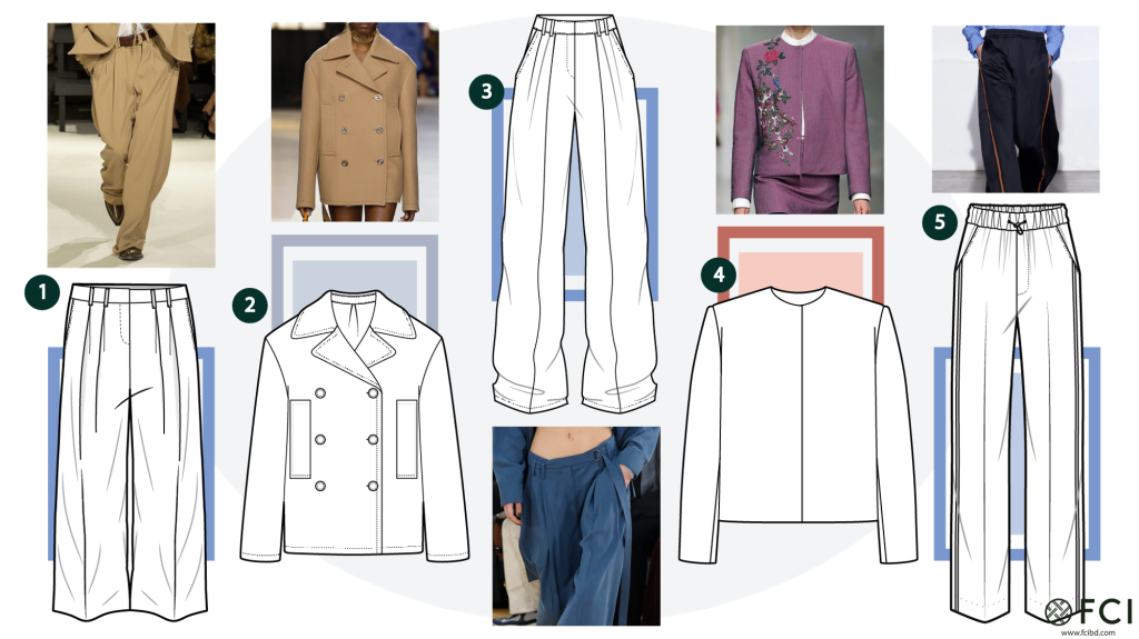 Wide-leg pants, double-breasted coat, pleated pants, crewneck sweater, and straight-leg pants—elegantly captured through technical drawings and photos to showcase precision and style.